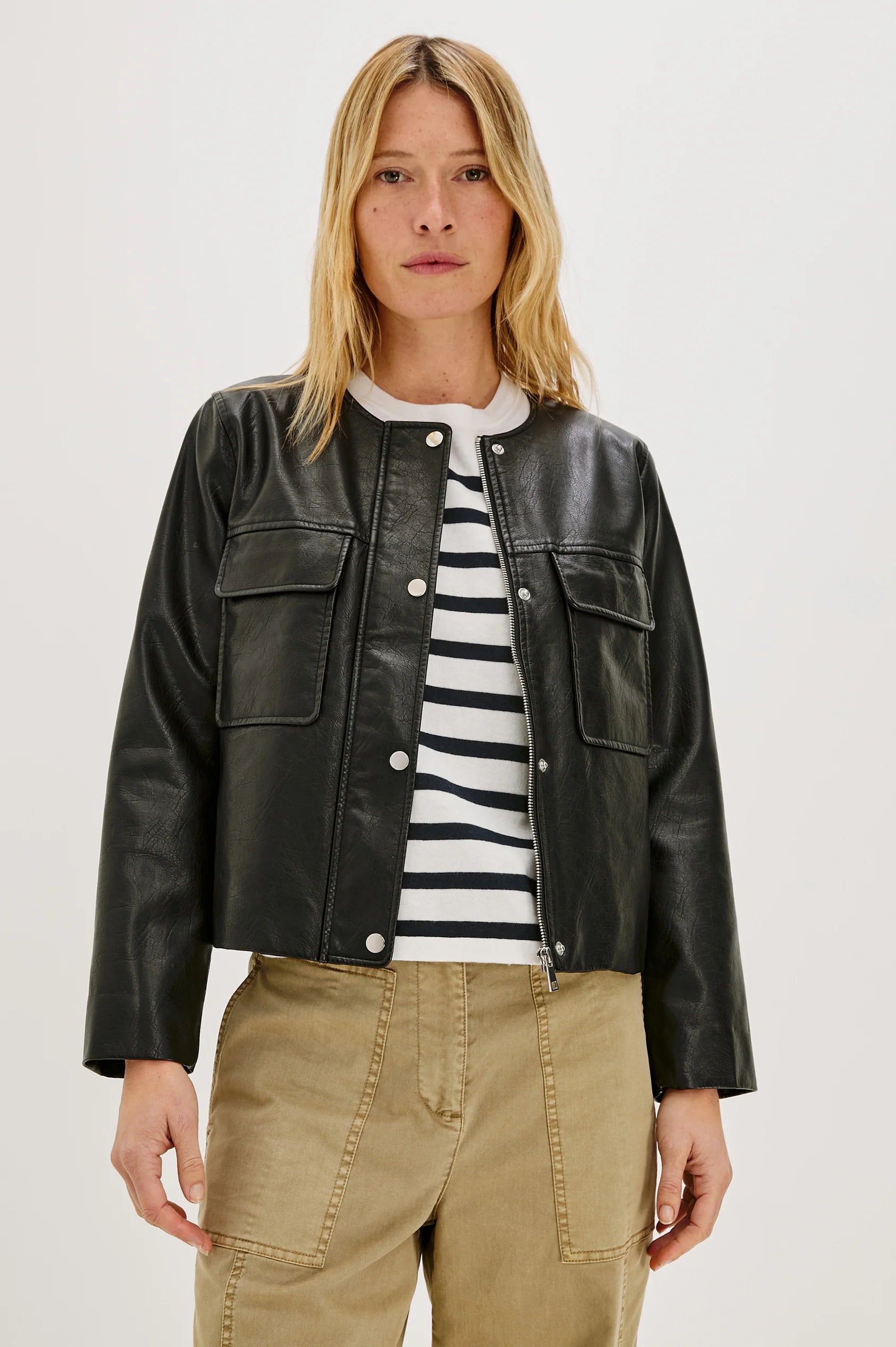 The Inka Jacket offers a chic, feminine silhouette in high-quality faux leather. Designed with a cropped, boxy cut and classic chest pockets, this jacket brings timeless style with a slightly worn-in faux leather look for effortless edge.