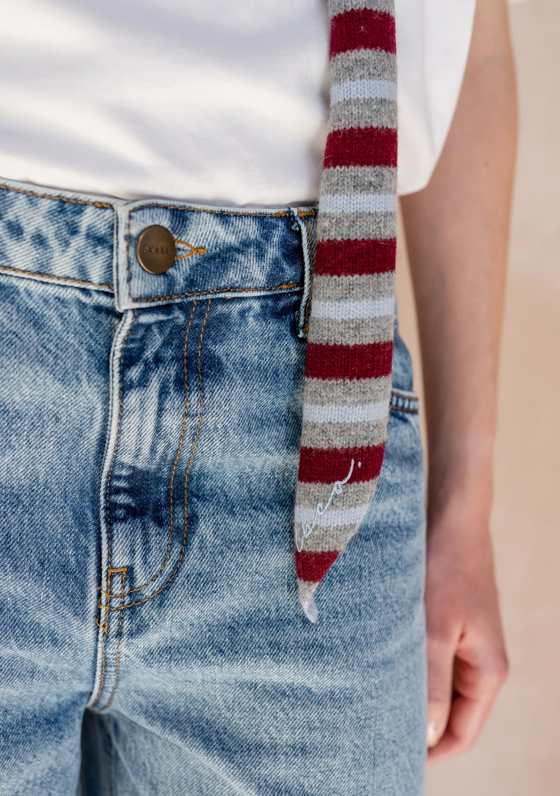This striped neck tie proves that understated elegance speaks volumes. Crafted from luxuriously soft merino wool in rich burgundy, grey, and light blue tones, it brings vintage-inspired character to any outfit without demanding attention. The lightweight, breathable fabric makes it ideal for transitional weather—comfortable enough to wear all day, yet refined enough to elevate your look. Whether layered over a sweater or worn solo, this piece delivers that perfect balance of personality and practicality that transforms a simple ensemble into something memorable.
